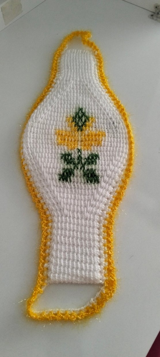 Sarı çiçek desenli, turuncu kenarlı beyaz banyo süngeri, nazik peeling için dokulu yüzeye sahiptir.