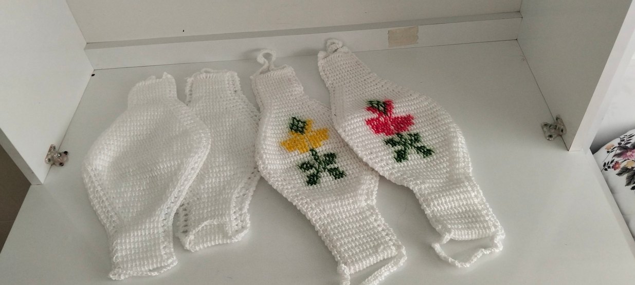 Renkli çiçek desenleriyle süslenmiş beyaz örgü banyo süngerleri, kolay asılabilmesi için halkalıdır.