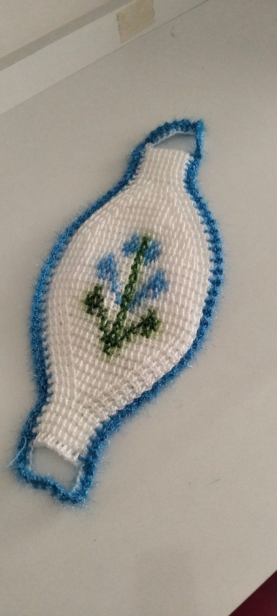 Mavi kenarlı, ortasında çiçek nakışlı beyaz banyo süngeri, asma halkasıyla pratik kullanım sağlar.