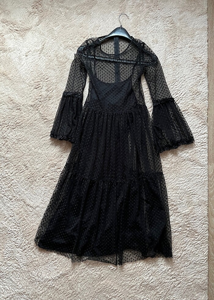 Astarlı siyah benekli tüllü elbise. Markası Lc Waikiki etiketi yok.