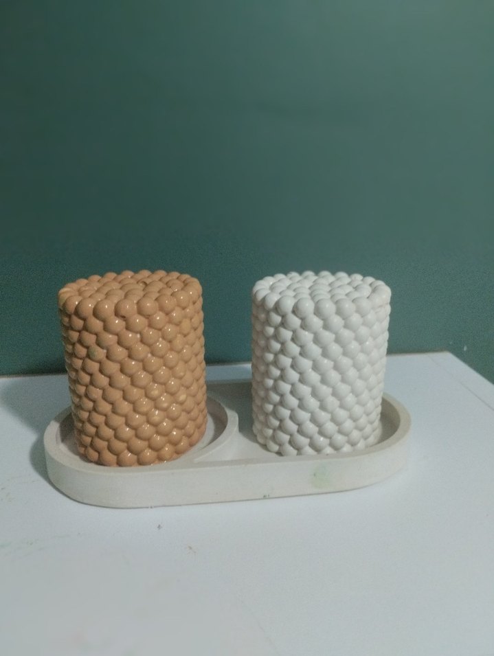 Beyaz ve kahverengi dokulu iki mum, üzerinde 'H' harfi bulunan beyaz bir tutucuda yer alıyor. ️