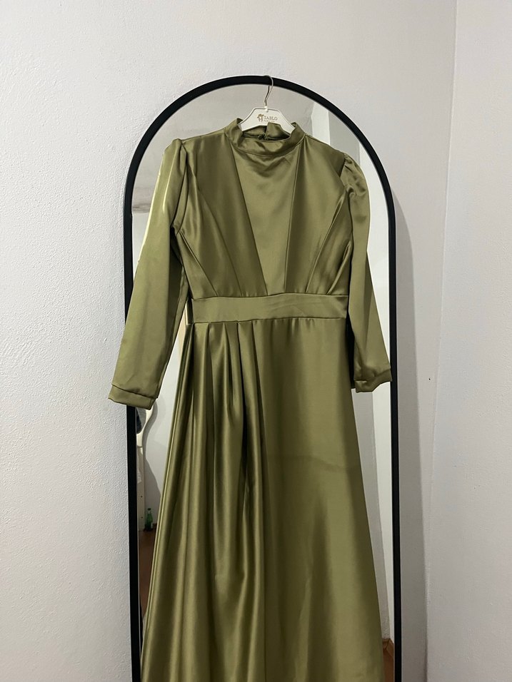 Haki renginde, uzun kollu ve yüksek yakalı drapeli uzun abiye elbise. Parlak dokusu ve düzenli kesimiyle modern klasik tarzı yansıtıyor. ✨