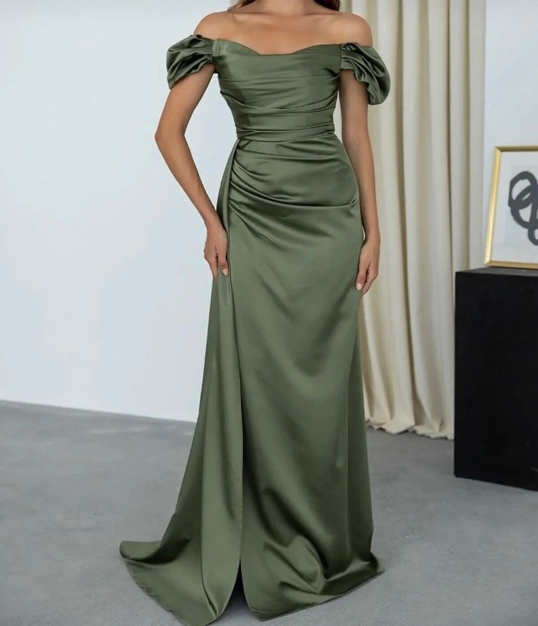 Bu haki uzun abiye elbise, drapeli tasarımı, tekne yakası ve kısa kollarıyla dikkat çeker. Düzenli kesim ve parlak dokusuyla düğün ve özel anlar için uygundur. 3 saatlik giyildi hiçbir sorunu yoktur.