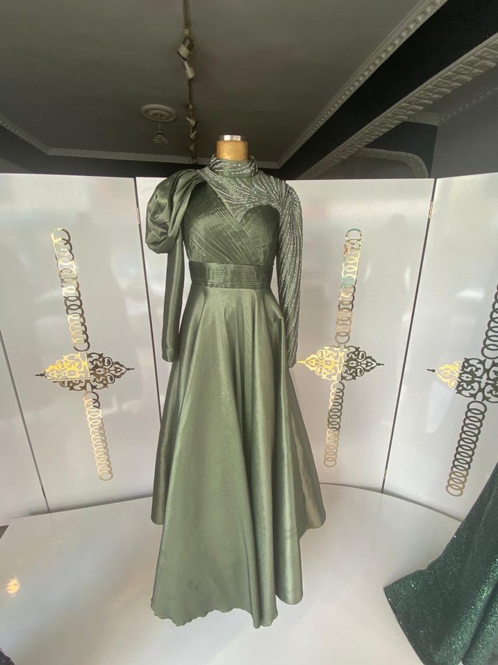 Bu haki uzun abiye elbise, yüksek yakalı ve uzun kollu drapeli tasarıma sahiptir. Parlak kumaşı ve modern klasik stiliyle düğünler için uygundur. Rahat ve şık bir kesime sahiptir. ✨