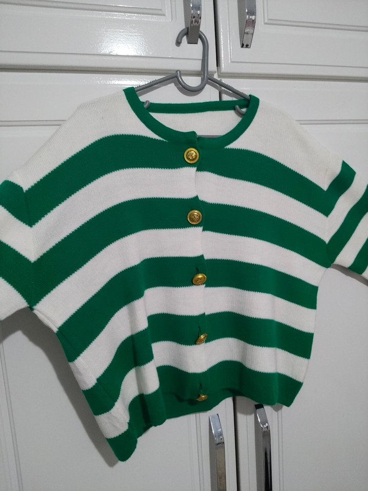 Düğmeli, kısa kollu, yeşil-beyaz çizgili, yumuşacık bir kumaşı vardır, düğmelerinin üstünde çapa işareti vardır,salaş bir kesimi var fiyatta yardımcı olurum