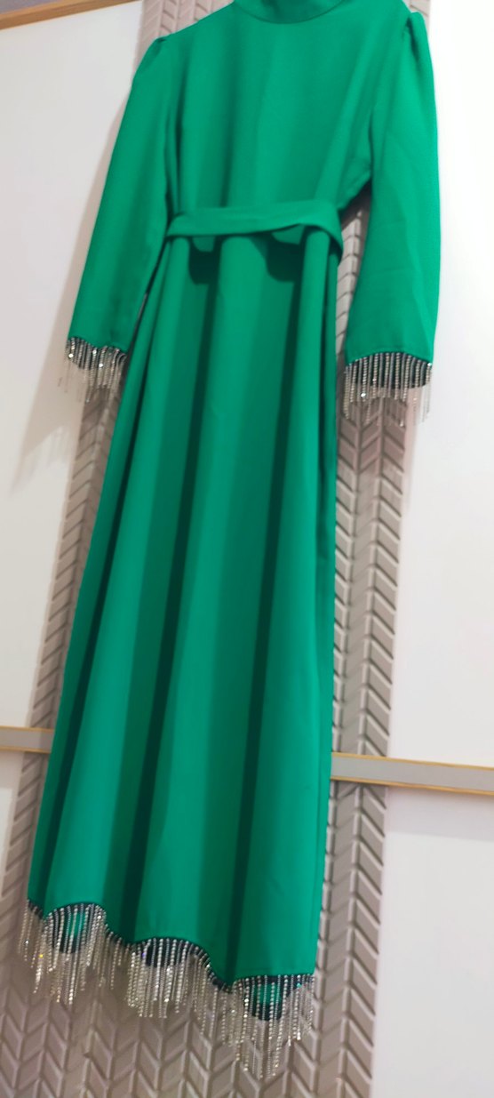 Benetton yeşili kol uçları ve etek ucu zincirli taşlı şık kalem elbise krep kumaş 1 kere giydim sadece 48 beden 46 beden uyumlu