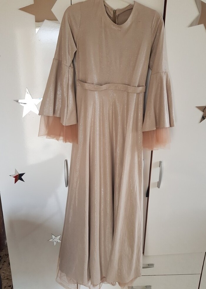 Özel günlerinizde giyebileceğiniz çok şık bir elbise kırem rengi simli etegin altında tüller var kollarda tül var özel dikimdir bir defa giyildi