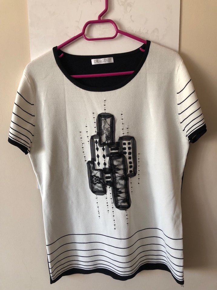 Ön kısmında farklı dokularda tül ve dantel aplikeler ile zenginleştirilmiş modern bir grafik desen bulunmaktadır. Üzerinde hafif ışıltı katan minik taş işlemeleri mevcuttur. Rahat bisiklet yaka ve kısa kollu formdadır. Birkaç kez kullanıldı. Hiçbir kusuru yoktur.