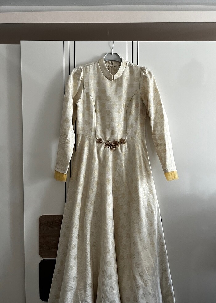 42/44 beden krem içinde sarı detaylar olan kolunda ve etek ucunda sarı tül detaylı bir elbise iki kez giyildi