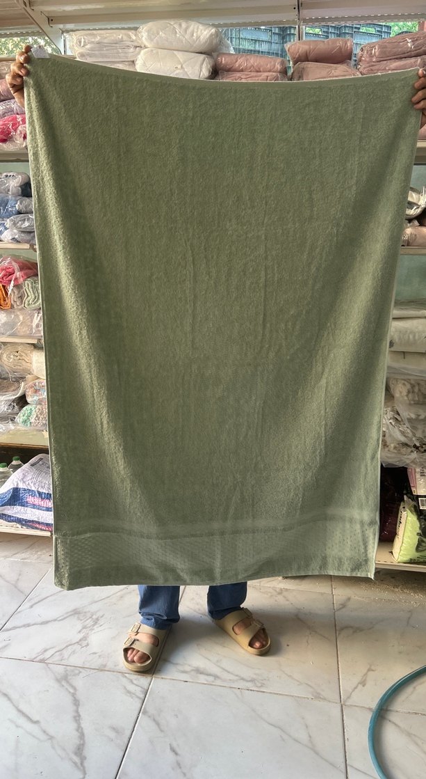 Parlak haki renkte, bohem tarzında, desensiz, yumuşak ve pürüzsüz dokulu havlu. 100-150 cm