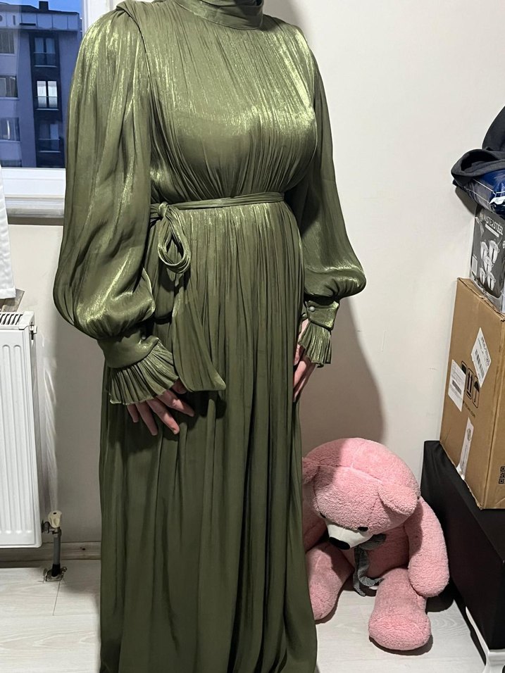 Uzun, bol kesim hamile abiye elbise, yüksek yakalı ve pileli manşetli uzun kolludur. İpeksi, parlak haki kumaştan yapılmış, drapeli ve bohem tarzda, düğünler için avant-garde modaseverlere uygun.