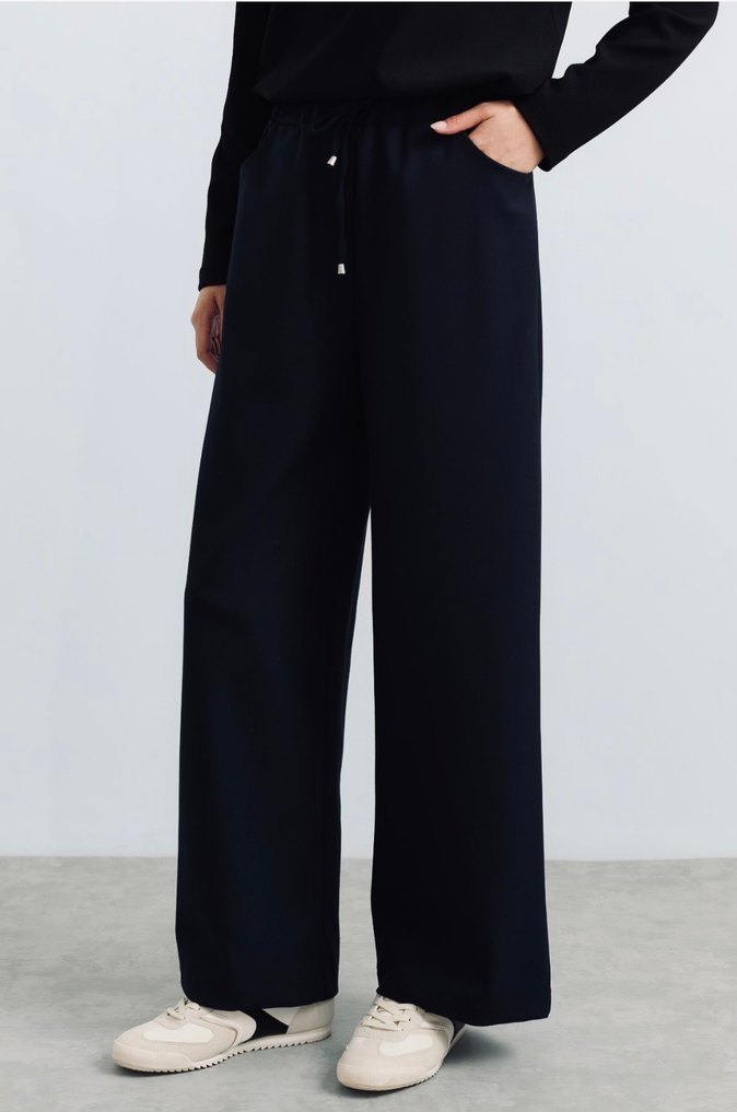 Sıfır…dökümlü tok krep kumaş…l beden…her iki yan cepli ..yüksek bel…bel lastikli ..bağcık detaylı …bol paça kesimi….38-40 uygun…Yeni sezon…mevsimlik…marka temsili..PALAZZO Kesim