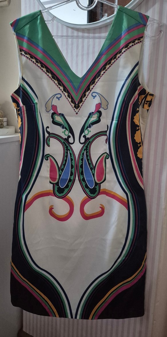 Az kullanılmış, canlı desenli, V yaka şık elbise. Dolabımda yer açtığım için uygun fiyata veriyorum.
