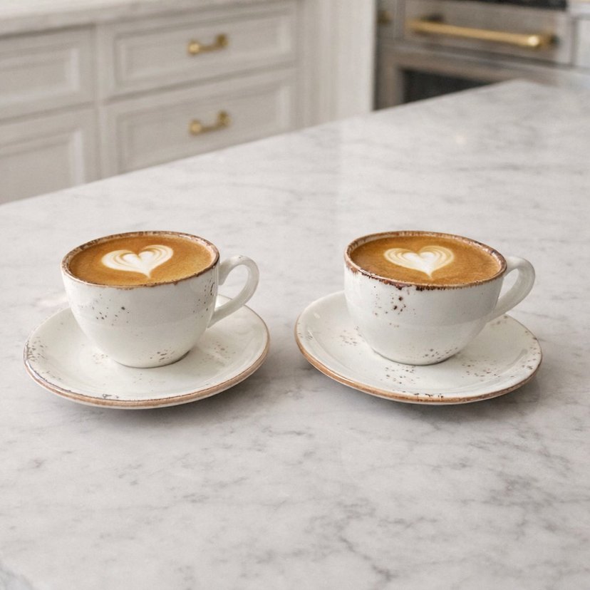 Rustik görünümlü 2 adet porselen kahve fincanı ve tabağı seti, cappuccino veya latte için uygundur. ☕. #kahve #kahvefincanı #çayfincanı #porselen #seramik #tabak #kase #mutfak #sofra