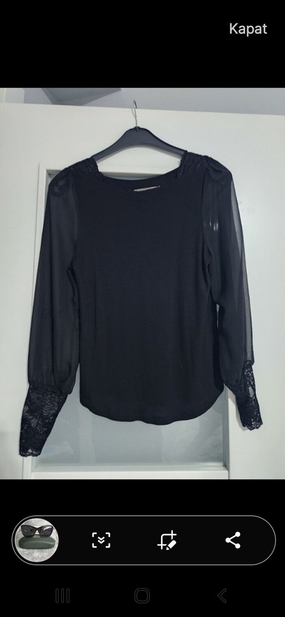 Dantel detaylı uzun kollu siyah bluz, yuvarlak yakalı ve bol kesim. Yumuşak sentetik kumaştan, ofis kullanımı için uygun.