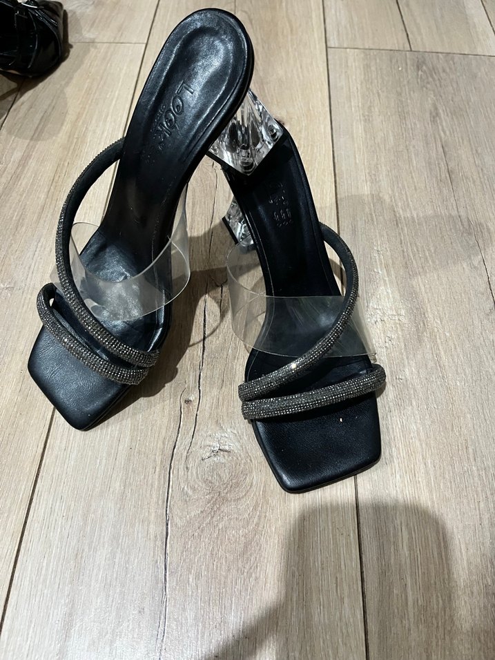 Siyah, parlak yılan desenli blok topuklu kadın ayakkabısı. Tokalı ve şeffaf bantlı, çağdaş tarzda, romantik akşamlar için uygun.