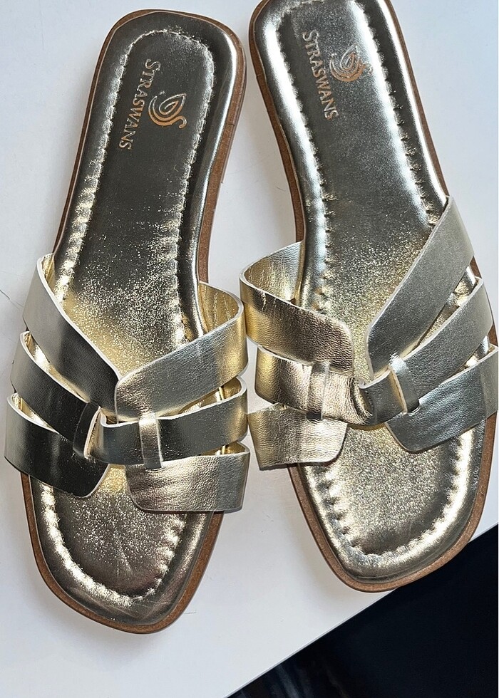 Ürün sadece deneme maksatlı evde bir kere giyilmiştir. Hiçbir şekilde dışarıda vs yerde terlik giyilmemiştir. Şık gold tonlarda bir rengi mevcuttur
