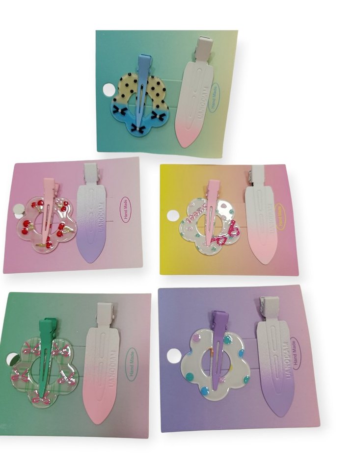 Pastel renklerde, boncuk detaylı ve desenli çocuk saç tokası seti, renkli ve eğlenceli bir tarz sunar.