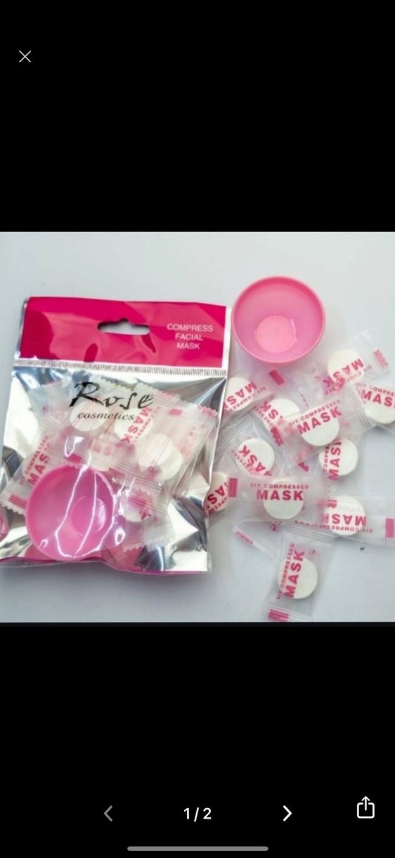 Suda açılan sıkıştırılmış yüz maskeleri ve hazırlık için küçük pembe kase içerir. Cilt bakım rutini için uygundur.