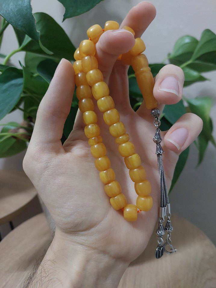Parlak sarı renkte, Ağır gumus kombinli usta kalitede tesbih 1.sınıf ve elden çıkma kusursuz ve hatasız tesbih Hatalara Açığız