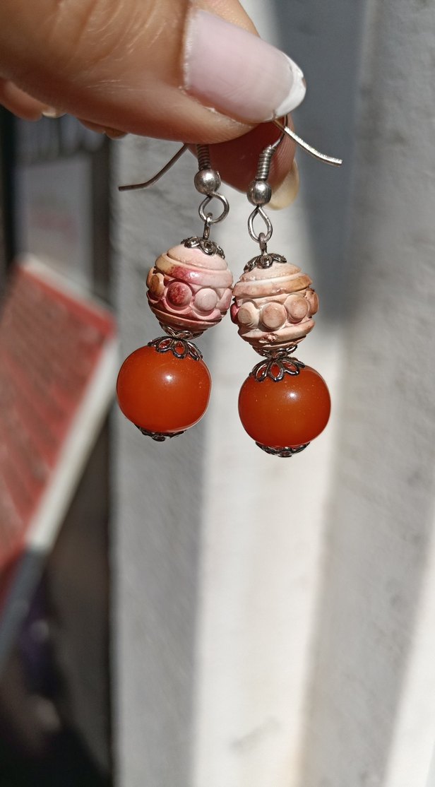 Renkli desenli Lületaşı boncuklardan oluşan kısa uzunlukta, vintage bohem tarzda koyu turuncu küpeler, romantik akşamlar için uygun.
