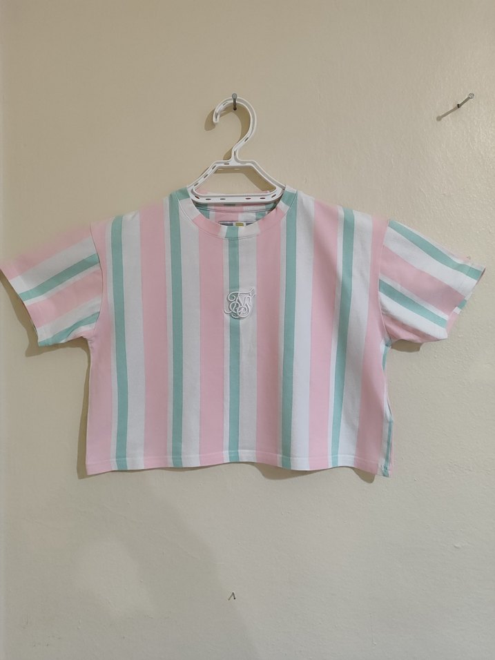 Bu şirin ve modern crop tişört, pastel pembe–yeşil–beyaz dikey çizgileriyle hem ferah hem de enerjik bir görünüm sunar. Göğüs kısmındaki zarif nakış logo detayı, ürüne şık ve kaliteli bir hava katar.