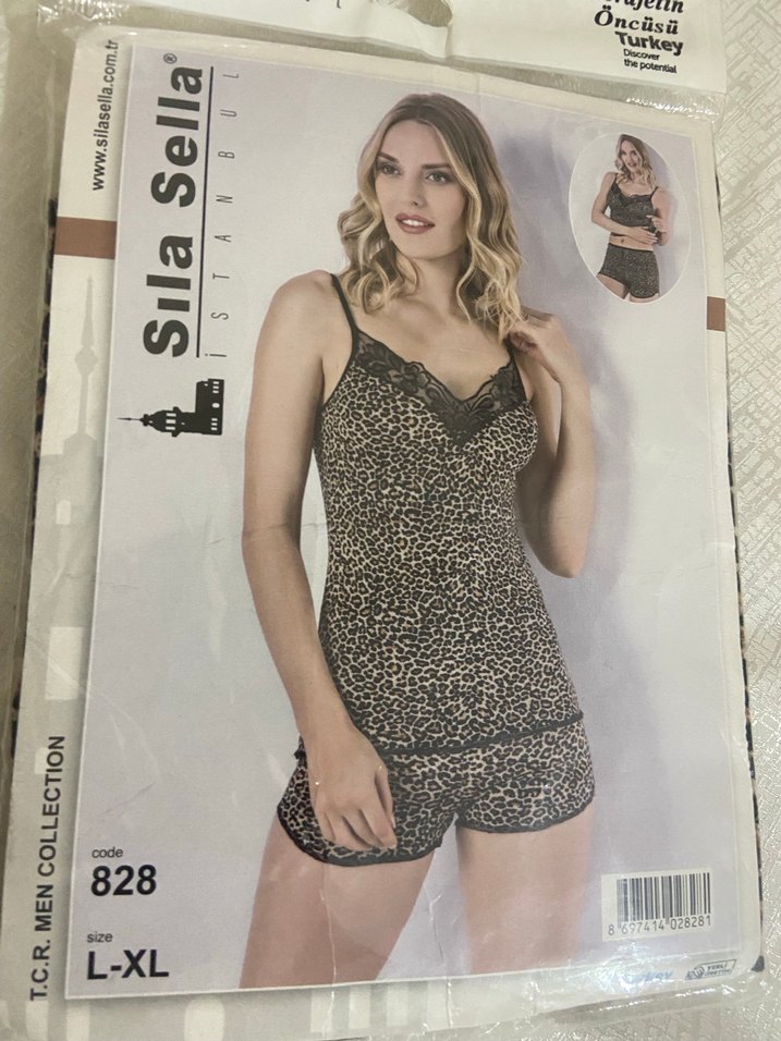 Sıla Sella markasının, leopar desenli, kolsuz ve mini boy kadın pijama takımı, koyu kahverengi tonlarında, L-XL beden.
