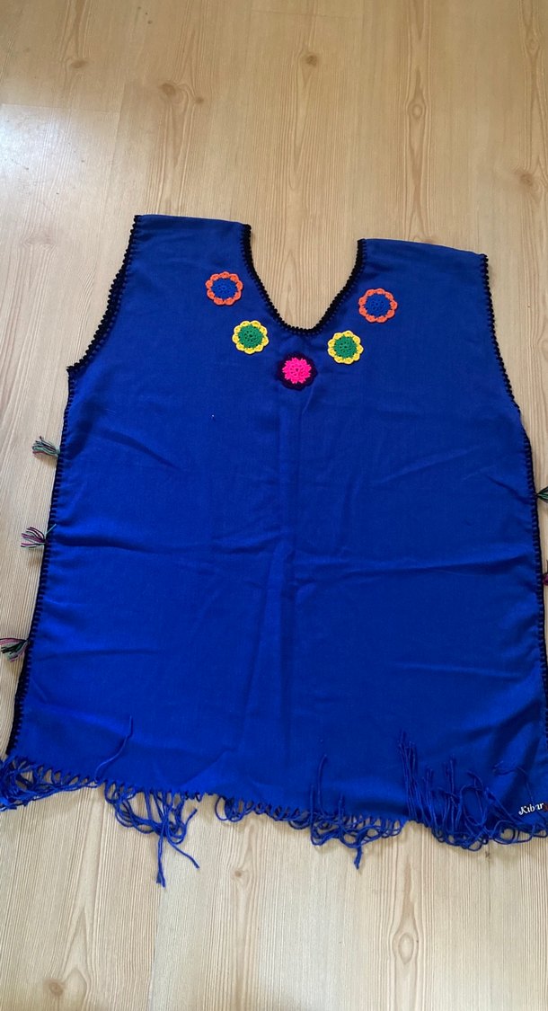V yaka, nakışlı renkli çiçek detaylı, püsküllü etek ucu ile bohem tarzda mavi, kolsuz, bol kesim elbise paryo yerine de kullanabilirsiniz