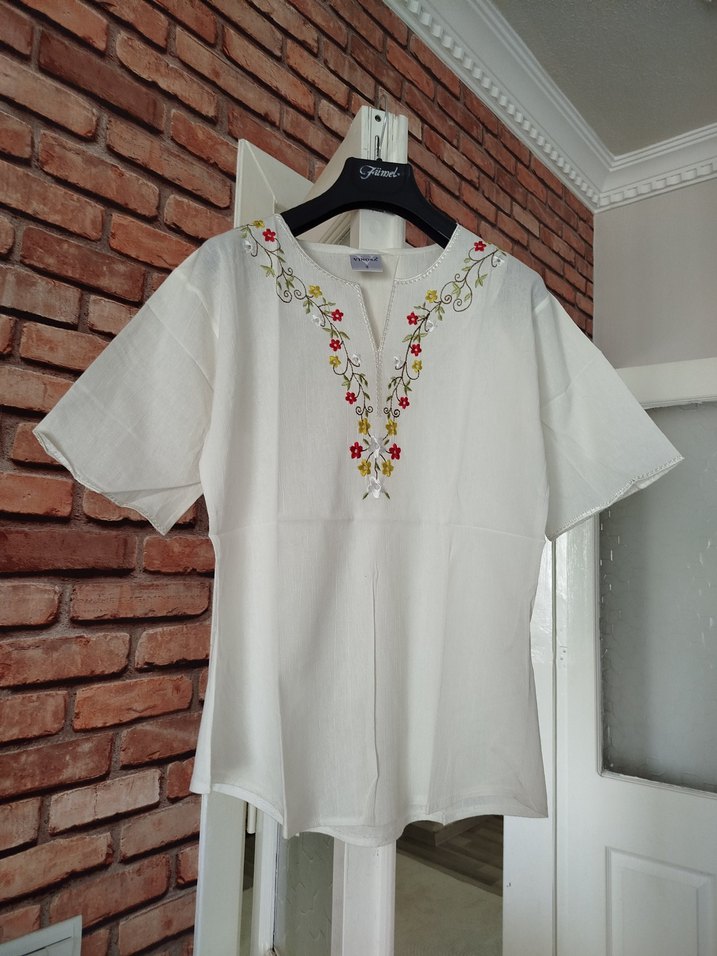 hiç kullanılmadı farklı deseninden kullandım yıkanınca yumuşacık oluyor..paketinde bekledi pamuklu, V yaka ve kısa kollu, bol kesim kadın bluz. Üzerinde nakışlı çiçek desenleri ve düğme detayları bulunur. Günlük kullanıma uygundur.
