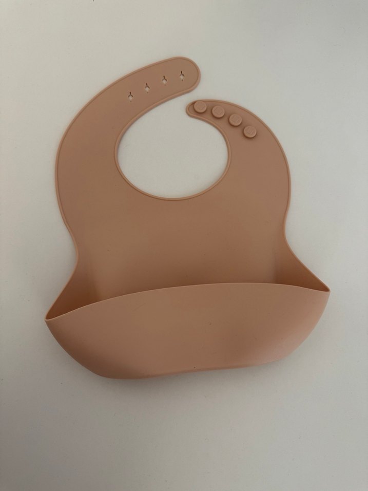 Ayarlanabilir düğmeli, yakalama cepli somon renk silikon bebek önlüğü. Temizlemesi kolay ve dayanıklı.