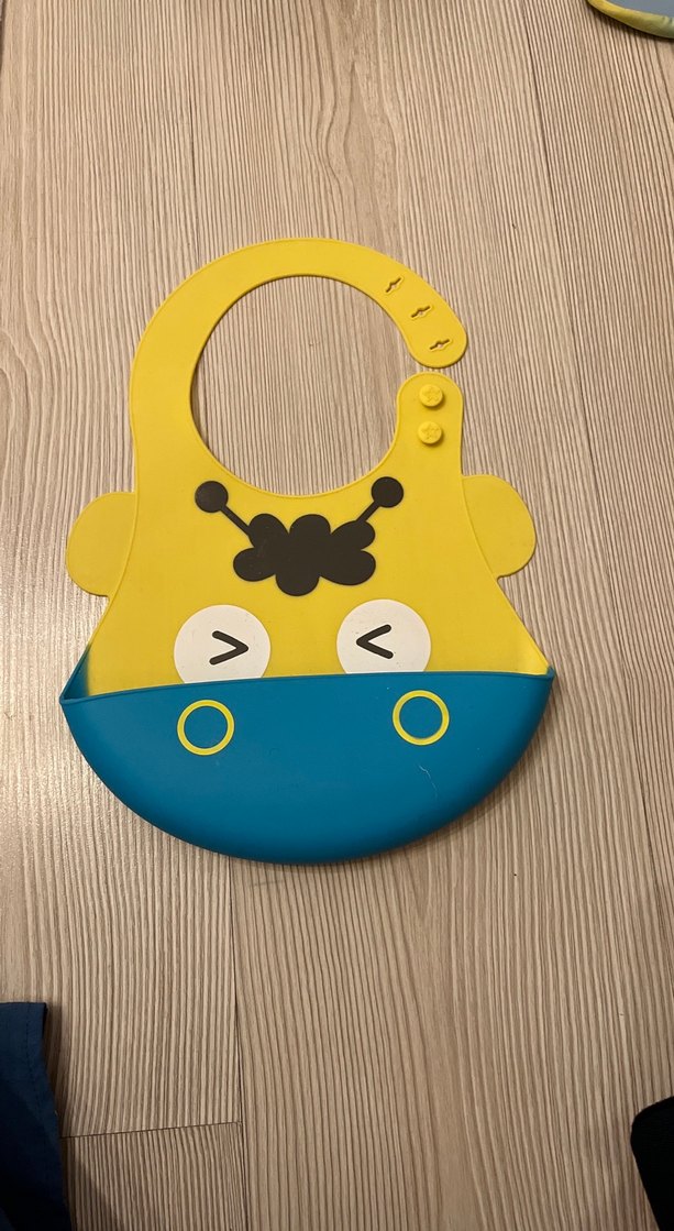 Renkli, baskılı sarı bebek önlüğü, mavi cep ve ayarlanabilir düğmeler içerir. Küçük bir kesilmesi mevcut o nedenle fiyat uygundur