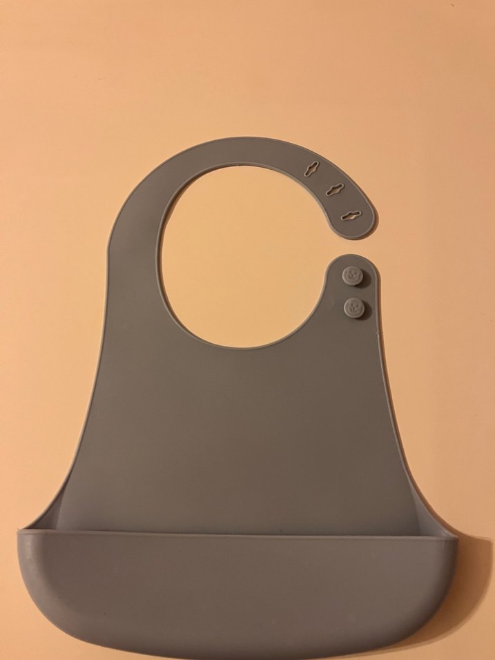 Ayarlanabilir boyun kayışı ve döküntüleri yakalayan cebe sahip gri renkli, yumuşak ve esnek malzemeden silikon bebek önlüğü. Az kullanılmış sıfır ayarındadır.