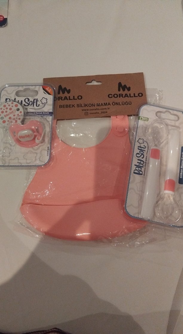 Pastel pembe renkli, silikon bebek mama önlüğü Askılı Emzik ve Silikon Kaşık Yaka tipi yuvarlak ve askılıdır. hijyen nedeniyle iade kabul olmamaktır