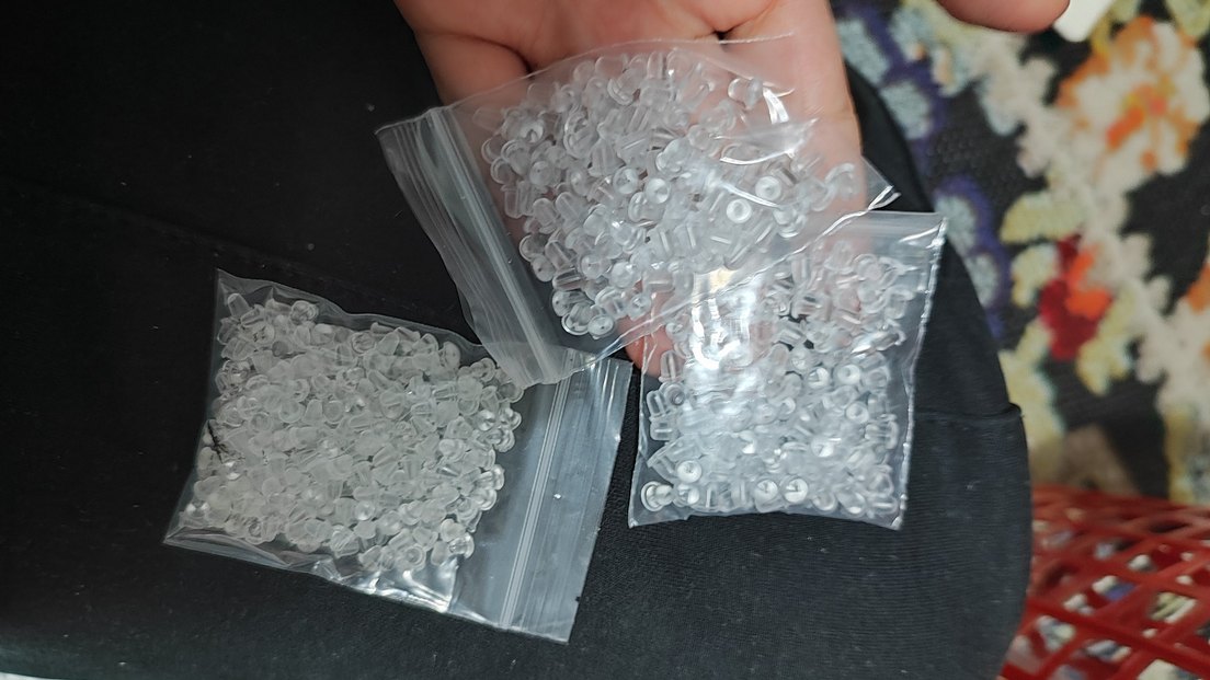 Küçük plastik poşetlerde şeffaf silikon küpe seti. Hiç kullanılmadı.