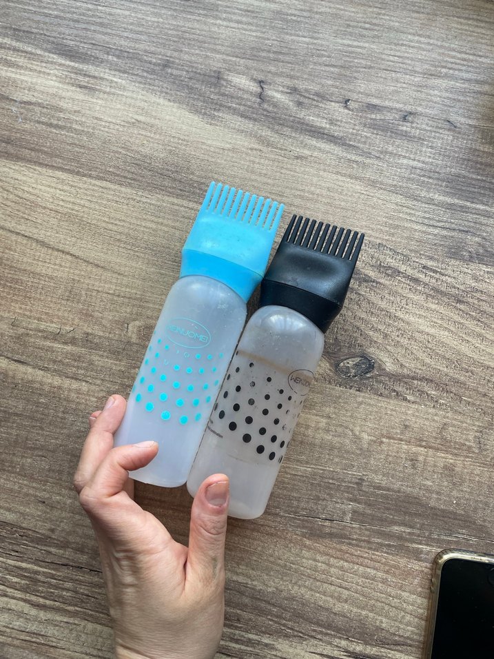 Mavi ve siyah silikon uçlu saç boyama şişesi seti, kolay ve hassas uygulama için tasarlanmıştır. ♀️