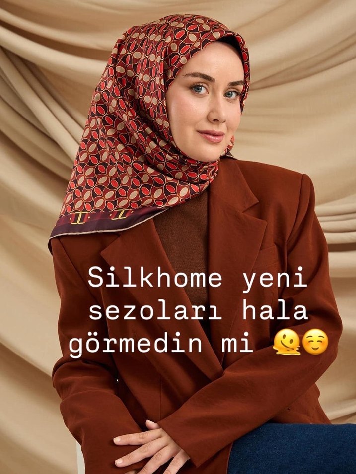 Koyu kahverengi, ipek dokulu kadın eşarp, drapeli tasarımıyla geleneksel ve bohem tarzı yansıtıyor. Üzerinde "Silkhome yeni, görmedin mi, sezolari hala" yazısı bulunuyor