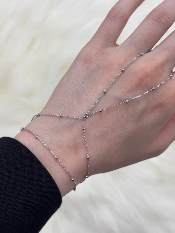 Minimalist tarzda, zincir detaylı gri renkli kadın el zinciri. Günlük kullanıma uygun sade ve desen içermeyen tasarım. ✨