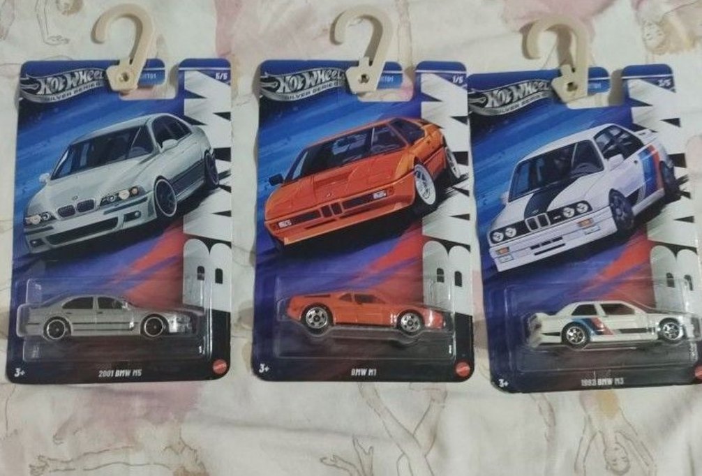 paketlerin hepsi hiç açılmamıştır, arabaların tümü 0dır. 2001 BMW M5 Silver 2021 Mattel- BMW M1 turuncu 1982, 2011 Mattel-1992 BMW M3 2011 Mattel