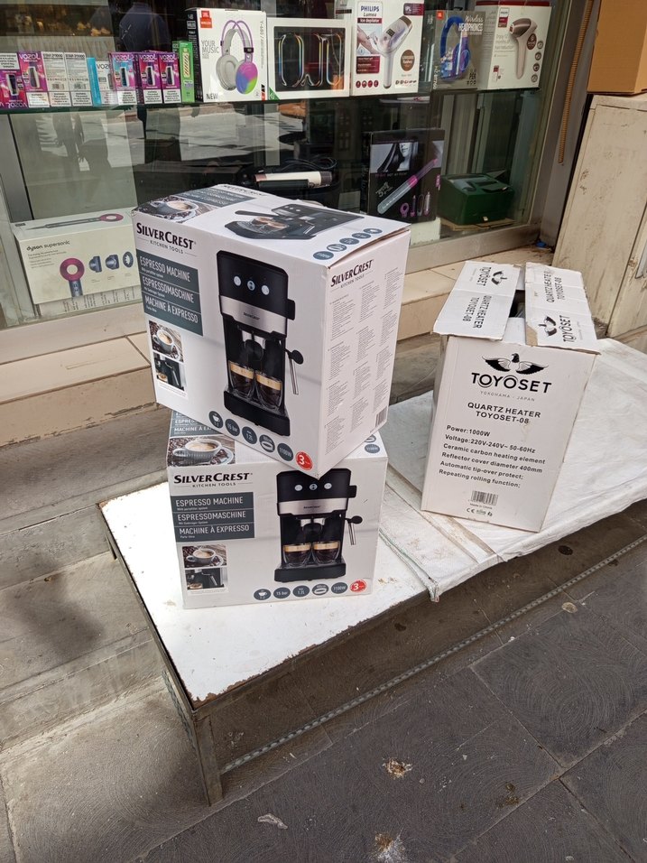 SilverCrest espresso makinesi, gri ve beyaz renklerde, espresso ve cappuccino yapmaya uygun kompakt tasarıma sahiptir. Çeşitli kontrol düğmeleri bulunur. ☕
