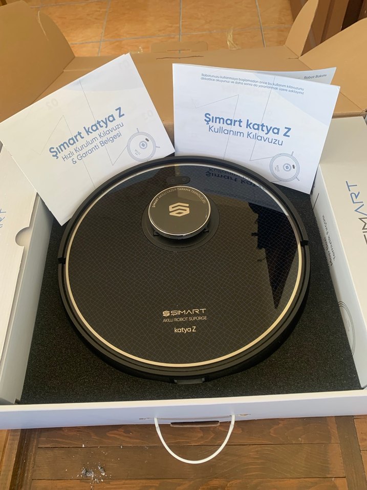 Simart Katya Z siyah renkli robot süpürge, kullanma kılavuzu ve garanti belgesi ile birlikte gelir. Şık tasarıma sahiptir. Haritalandırma, sesli komut özelliği, Şarj istastonuna dönüş, vileda paspas gibi sayamadığım birçok özelliği vardır 3500 pa emiş gücüne sahip, gayet memnunduk, özel sebeplerden dolayı satıyorum. 1 yıldan fazla süre garantisi devam etmektedir ( sadece çorum içi satılıktır )