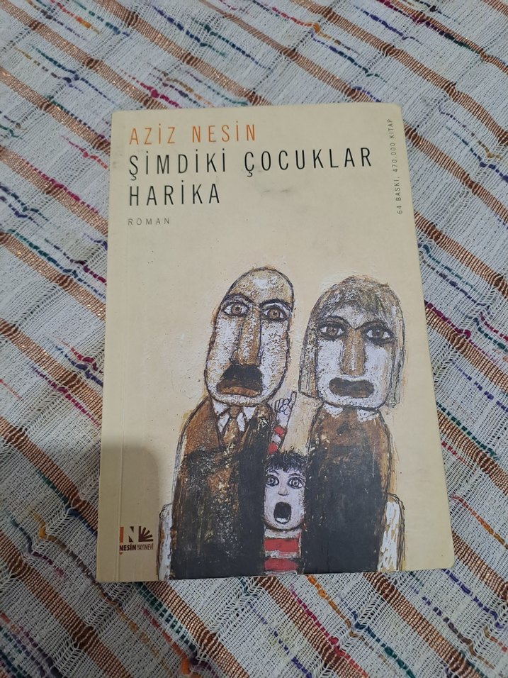 Aziz Nesin'in "Şimdiki Çocuklar Harika" adlı romanı, özgün kapak çizimiyle dikkat çeken bir sanat kitabıdır.