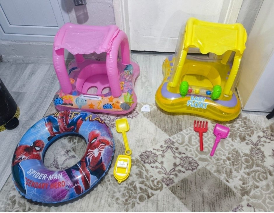 Sarı simidin ön kısmında iğne deliği kadar hava kaçağı vardı, tamir kiti ile onarıldı, şişirdim sönme olmadı, sorunsuz . son fotoğrafa ekledim. Sarı simit önündeki oyuncaklarla birlikte 380 tl , supermen simit sorunsuz temiz , pembe gölgeliklinin patlagi var , patlagi ek yerinde olduğu için, onarsamda yine hava kaçırıyor, bir iki saat idare eder , pembe simit ücretsiz, supermen simidin yanında vereceğim. supermen simit ve yanındaki oyuncaklar 280 tl