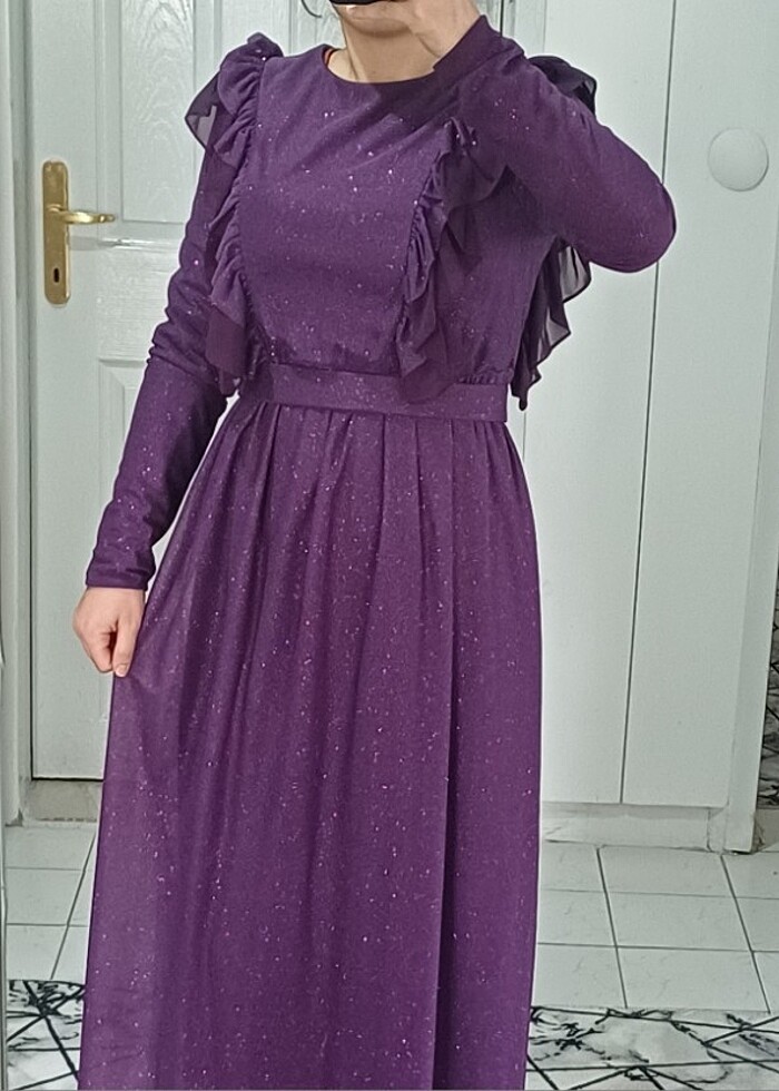 içi astarlı. omuzları fırfırlı. beli kemerli kemeri çıkabiliyor. simli abiye elbise #elbise #abiye #simli #tesettür #fırfır