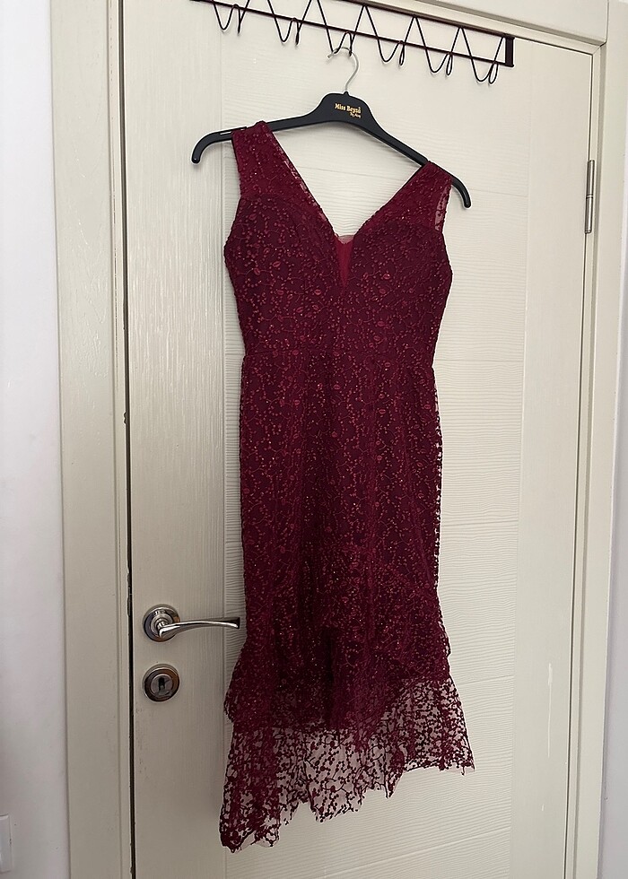 Sadece 1 kez kullanıldı. Etiketi 38 beden fakat terziyle 36 beden yapıldı. Önü kısa arkası biraz uzun midi boy bir abiye elbise. Hiçbir deformesi yoktur.