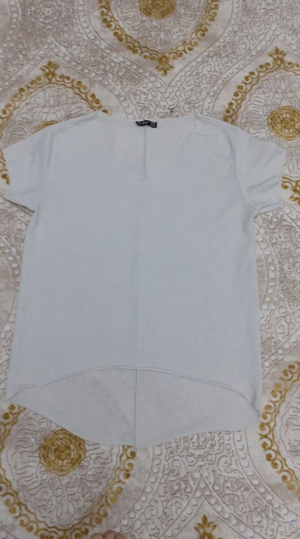 Simli kumaştan, V yaka ve kısa kollu kadın tişörtü. Rahat kesimi ve günlük sokak stiliyle öne çıkar.