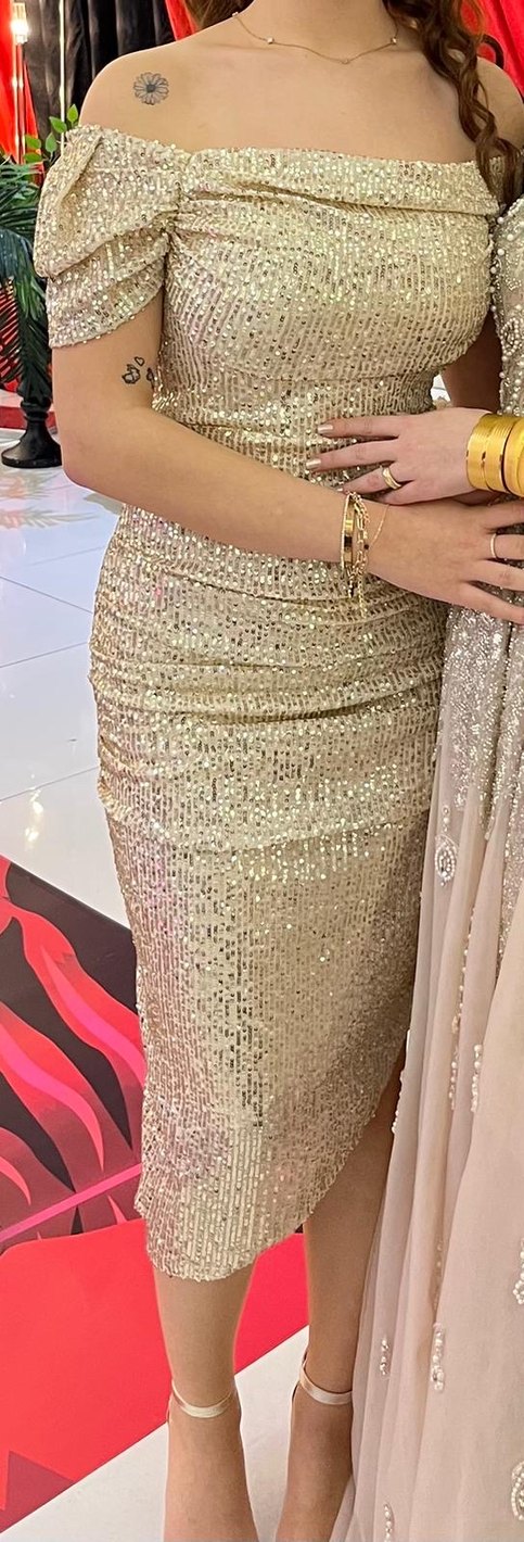 Simli ve işlemeli detaylara sahip, uzun ve vücuda oturan altın renkli nişan elbisesi. Kayık yaka ve ince askılı kolludur, cesur düğün görünümü için ideal. ✨