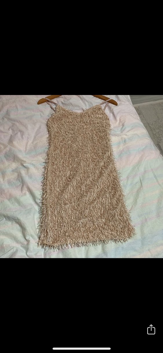 Yumuşak triko kumaştan yapılmış, bej renkli, straplez, kolsuz, vücuda oturan midi elbise. Rahat, bohem tarzda, dokulu örgü deseniyle günlük kullanıma uygun.