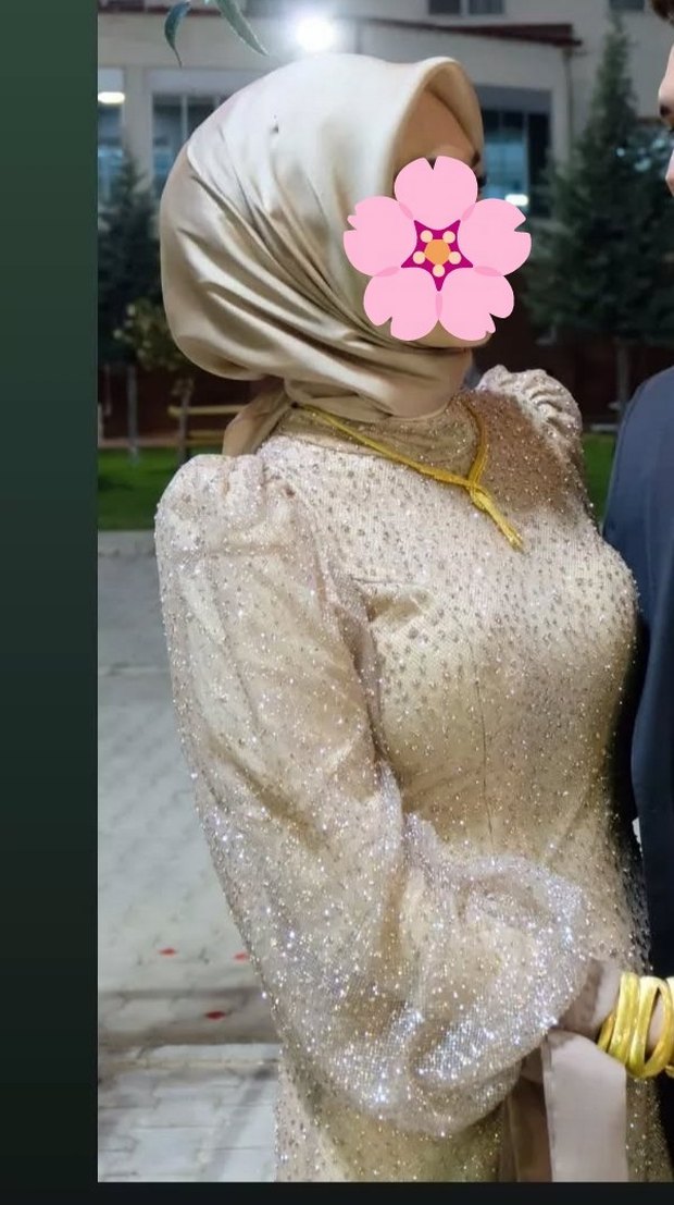 Taşlı bej uzun nişan elbisesi, kurdeleli kollu veyaka detaylı modern klasik tarzda, rahat kesimdir. ✨