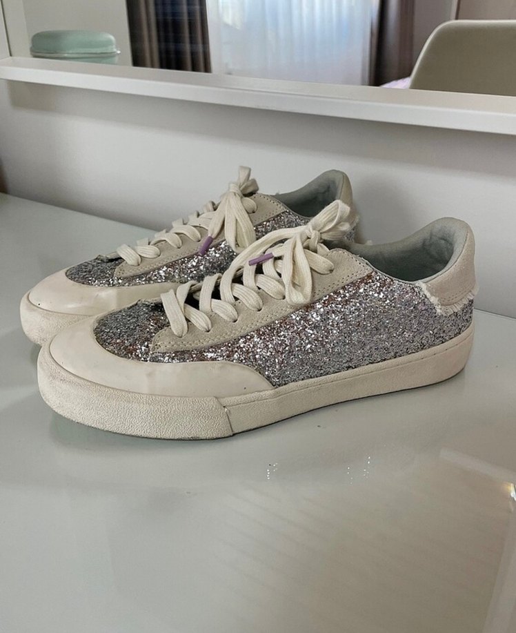 Simli detaylara sahip beyaz ve gri blok topuklu spor ayakkabı, baskılı desenli ve kauçuk tabanlı, romantik buluşmalar için uygun. ✨ 39