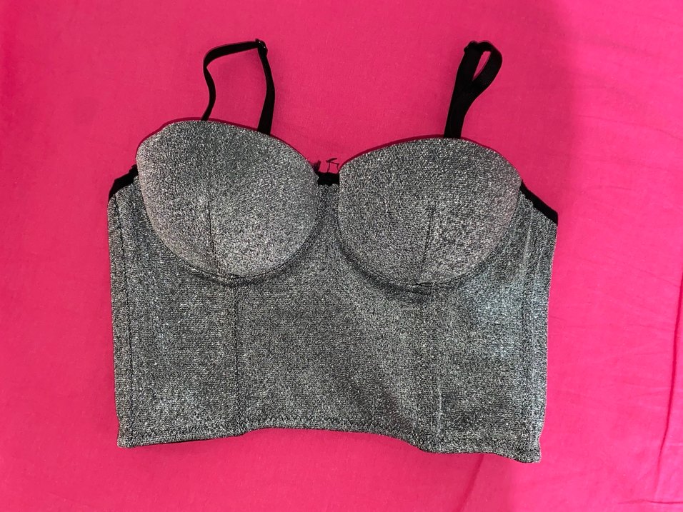 Hiç kullanılmadı, kombinleyemediğim için satıyorum. Çıkarılabilir askılı, sentetik kumaştan yapılmış, vücuda oturan simli büstiyer. ✨ 80 beden